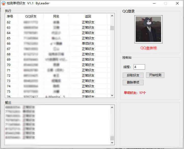 本源码由@Leader 编写,支持一键检测QQ单向好友,显示出单项好友的QQ并删除,用到了多线程。