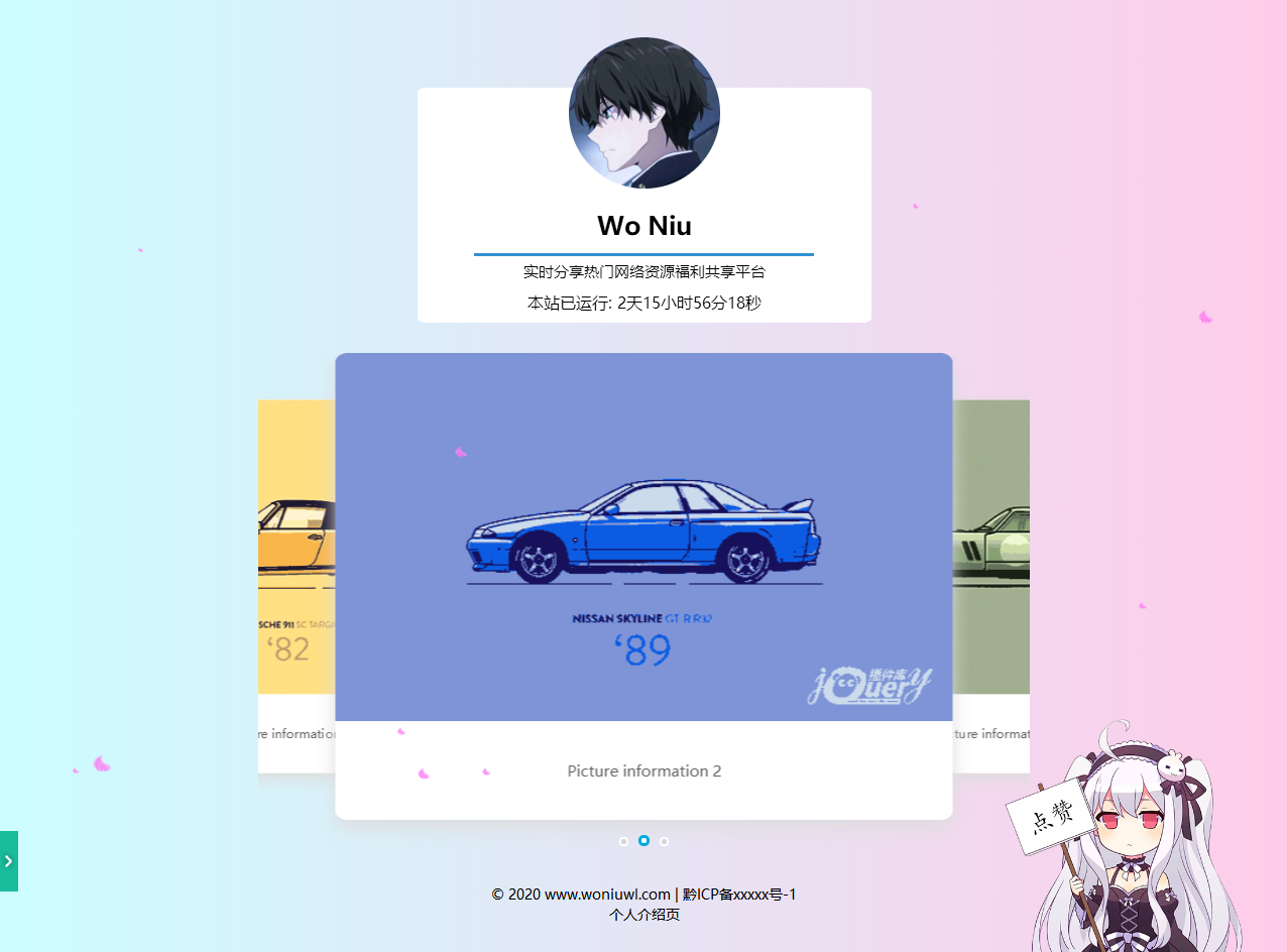 一款有音乐,有花瓣飘落,有看板娘,还有轮播图,轮播图可以添加跳转链接,非常实用的个人介绍导航页面,大家需要的自行下载!