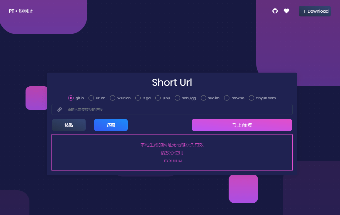 直接上传到你的站点即可,接口在api.php里面,自己对照着添加修改,记得在index.html里面添加单选,短网址接口里面写好了三个,需要更多自己添加,因为很多目前免费的短网址接口都要么有广告要么可以后台修改跳转,所以源码里没有加,自己酌情添加。