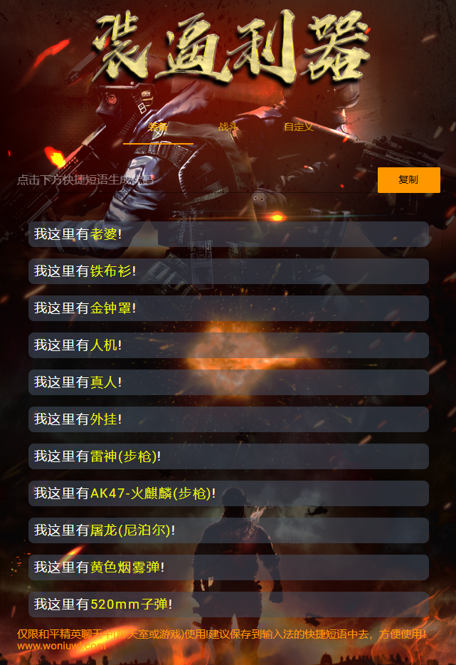 这个单页主要时用来快速生成和平精英的颜色代码,帮助你装逼!建议保存到输入法的快捷短语中去,方便使用!